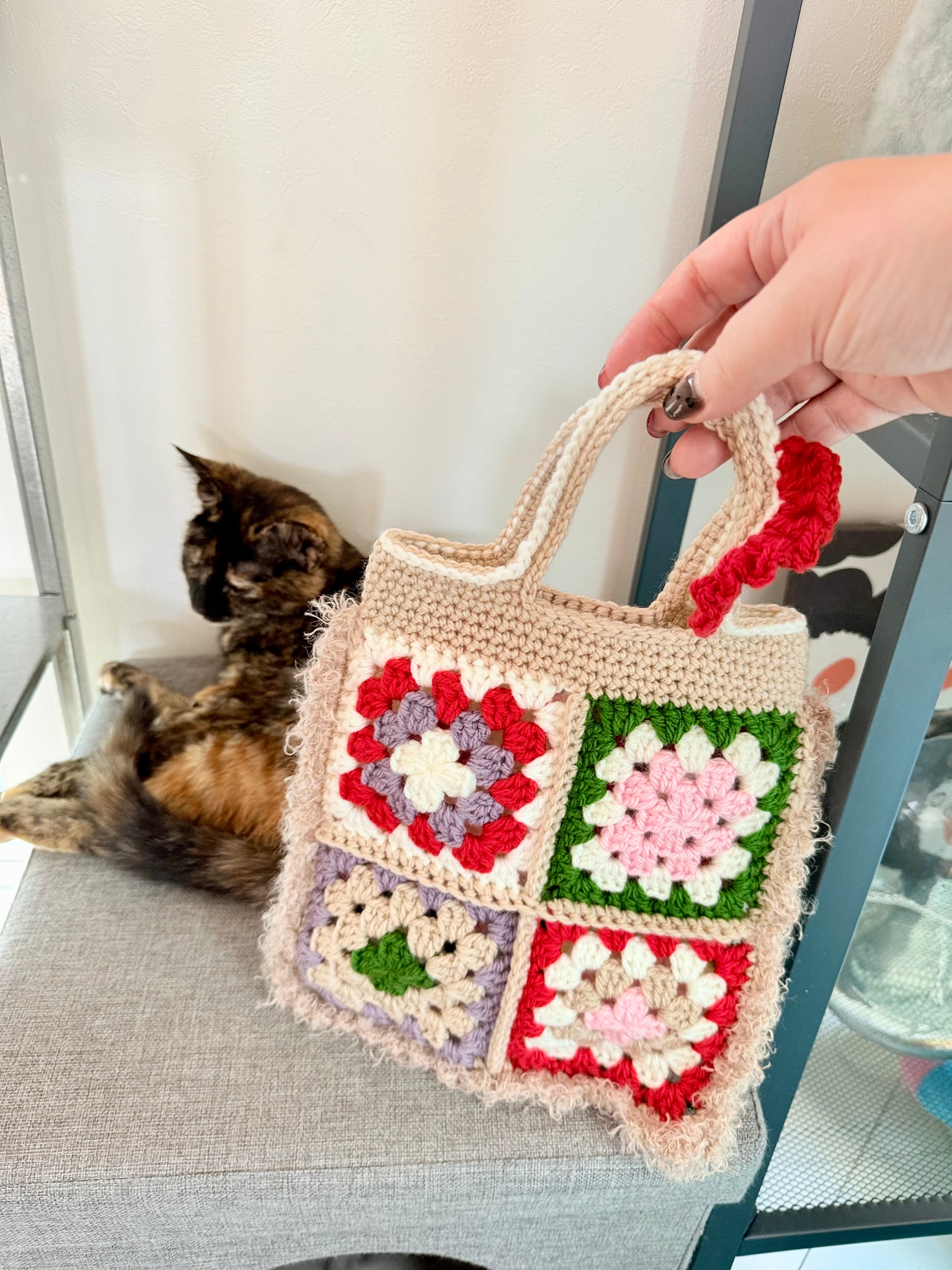 【推しにゃんステッカー付き/1点もの】 グラニースクエア ミニトートバッグ(お散歩バッグ)